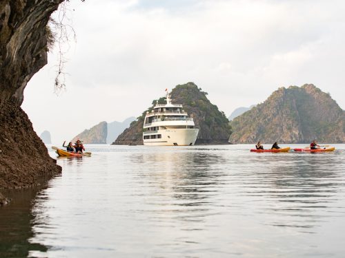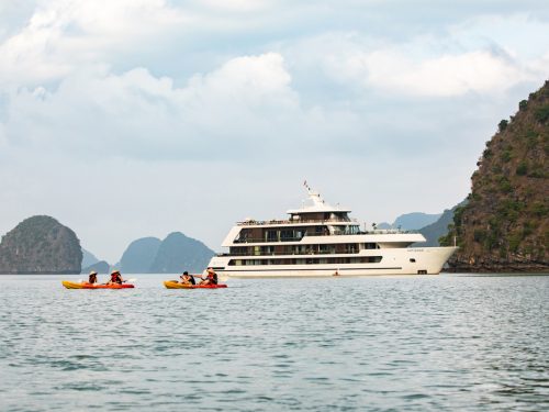 During the 3-Day Halong Bay Cruise, you will relax in spacious cabins with panoramic views, savor elegant dining prepared with fresh local ingredients, and enjoy amenities such as a swimming pool, spa and leisure facilities. This luxury Halong Bay cruise itinerary blends active exploration—kayaking in the sheltered waters of Ao Ech and rowing into the Dark and Bright Cave—with relaxed moments like sunrise Tai Chi on deck and evening squid fishing under the stars. Drone photography sessions (weather permitting) provide spectacular aerial perspectives of the emerald sea and karst formations.