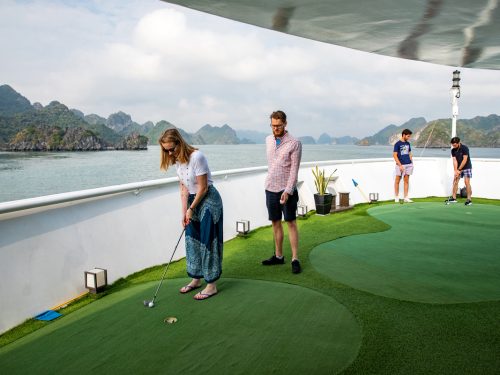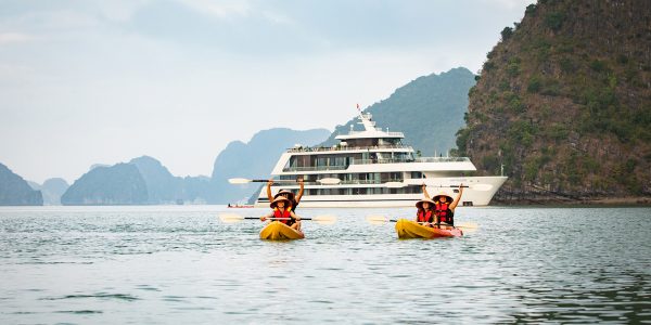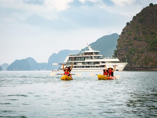 A standout activity on the 3-Day Halong Bay Cruise is kayaking in the Ao Ech area—paddle gently between towering karsts and discover hidden lagoons. Guests can swim in calm bays or relax by the cruise pool depending on operational conditions. These outdoor moments highlight why this Halong Bay itinerary is celebrated for natural beauty and peaceful seascapes.