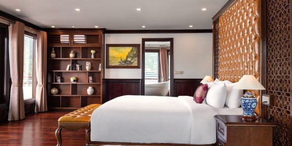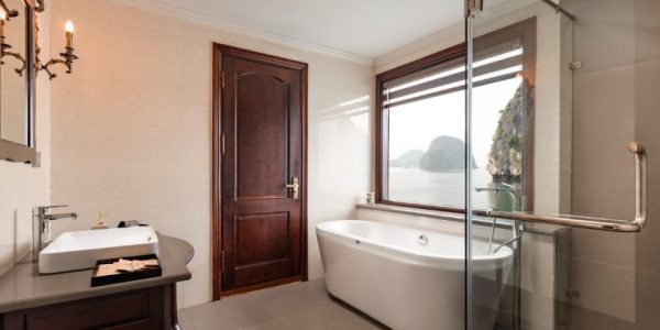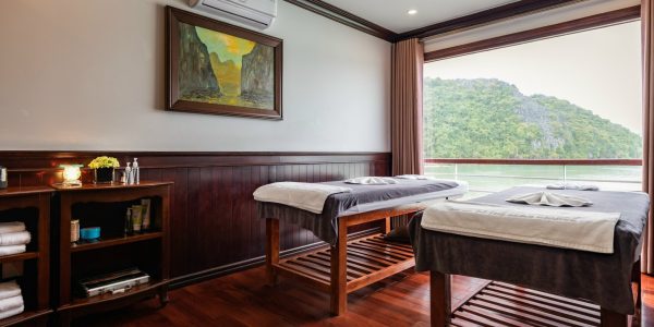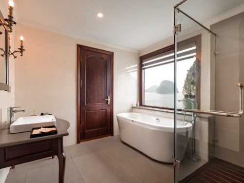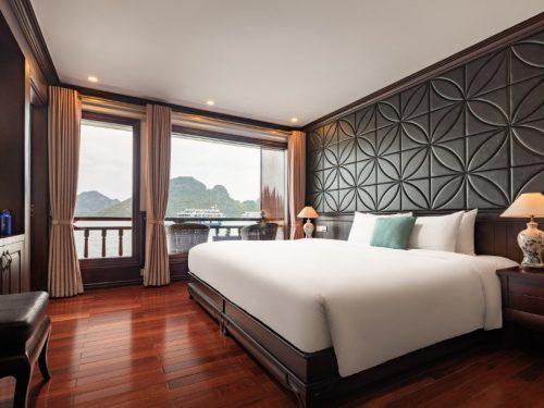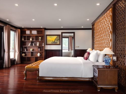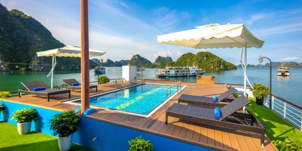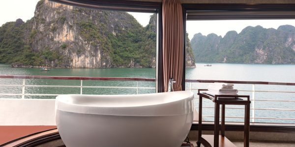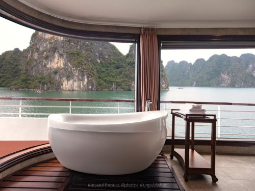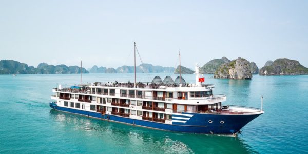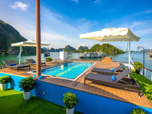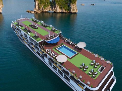 Aqua Of The Seas Cruise is a 5 star luxury super yacht offering an ultimate cruising experience through the spectacular landscape of Halong Bay – Lan Ha Bay. 30 cabins all are equipped with a private balcony and ocean-view bathtub. Aqua Of The Seas Cruise is also one of the minority of luxurious metal cruises possessing 2 luxury restaurants, an outdoor pool, Gym, Spa… With full facilities, professional service Aqua Of The Seas Cruise promises to bring guests the most memorable experience.