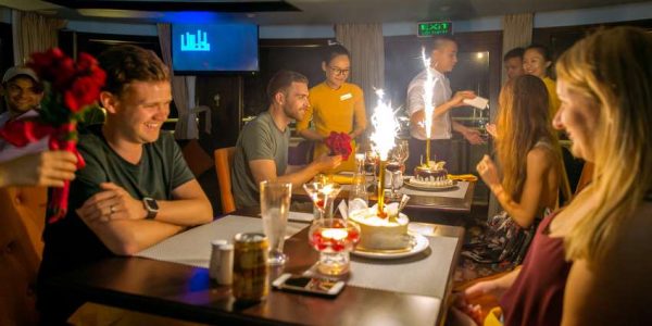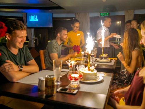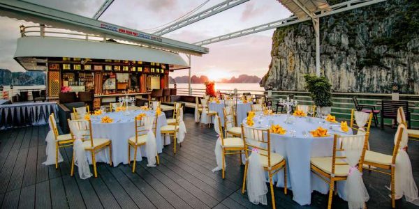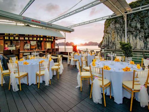 18:00-19:00: Enjoy freshly prepared snacks and your favorite drinks while waiting for sunset on Halong Bay. Take advantage of the Happy hours “Buy 1 get 1 free” drink while the sun is giving way to stunning twilight.