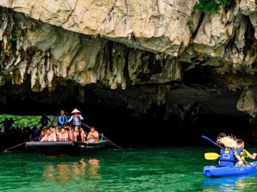 Explore Surprise Cave, one of the largest and most beautiful caves in Halong Bay. Then, take a kayak ride through Luon Cave, where you’ll witness the bay’s stunning formations up close. Finally, visit Titop Island, where you can swim or hike for panoramic views.
