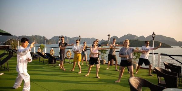 - 12:00: Arrive at Tuan Chau Port, transfer to the cruise by speed boat, welcome drink and briefing.