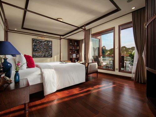 This boutique cruise starts at Halong Bay, which can be reached from Hanoi by a limousine bus. At noon, the boat’s team welcomes you on board to check in to your cabins.