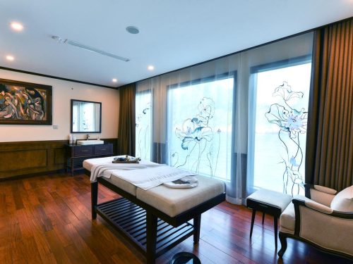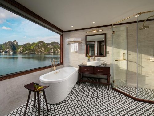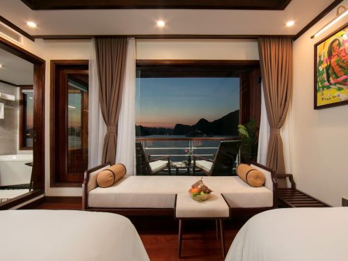 A few minutes into the cruise, you’ll be invited to savor Vietnamese dishes at the restaurant. The next highlight is the Tra Bau area or Ba Trai Dao Beach for swimming and kayaking. After returning to the cruise ship, you are offered such activities as a massage or afternoon tea.