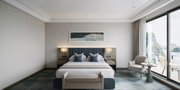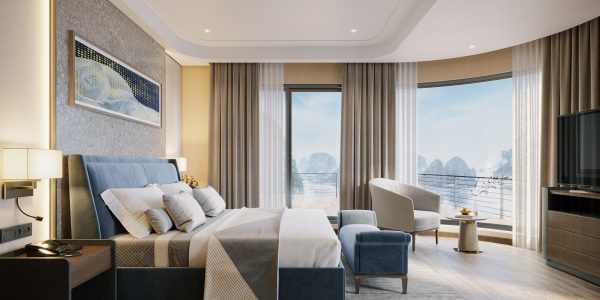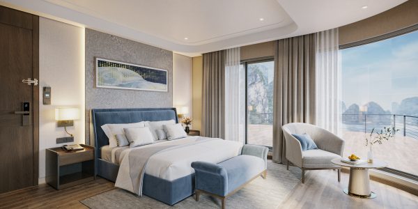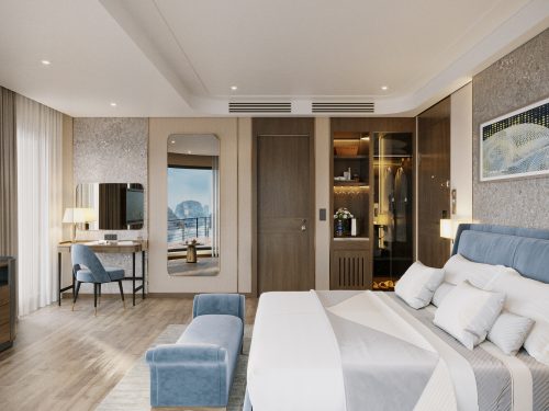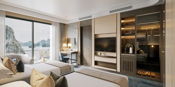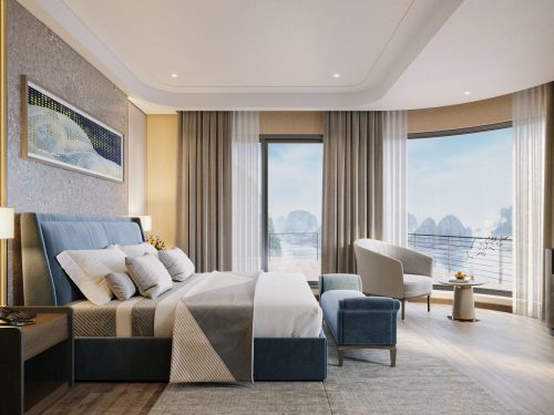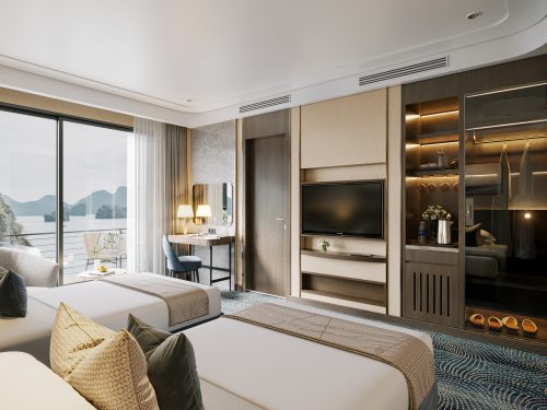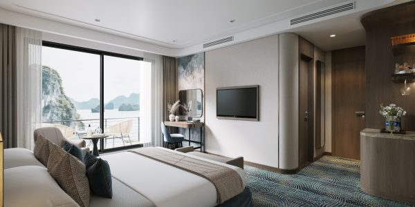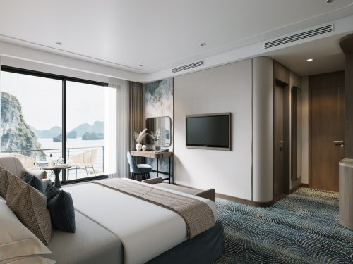 • Spacious luxury cabins with private balconies and panoramic views of Halong Bay.