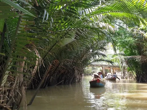 Enjoy the scenic journey along the way bordered by green rice fields. On arrived at My Tho, visit Vinh Trang pagoda, take a leisurely boat ride along the river, view the stilt houses, fruit plantations and fishing villages along the river bank. Proceed to Tortoise islet, have lunch in the orchard garden. Then a boat ride to An Khanh – a less touristy attraction in Ben Tre, enjoy cruising on a hand-rowed sampan under the shadow of the water coconut trees along natural canals, then enjoy seasonal fruit & honey tea to the sound of “Southern Vietnamese folk music”, performed by locals.