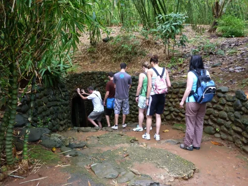 Today, ducks and water buffalos happily co-exist in the rivers along the side of the road. However, the peaceful rural rice paddy scenery belies the area’s violent history. Visitors will find it hard to imagine the destruction, damage & defoliation over this whole area, caused by bombing and mines. There is plenty of evidence of the fierce battle that took place here during the 1960s when Cu Chi was a “Free Target Zone”.