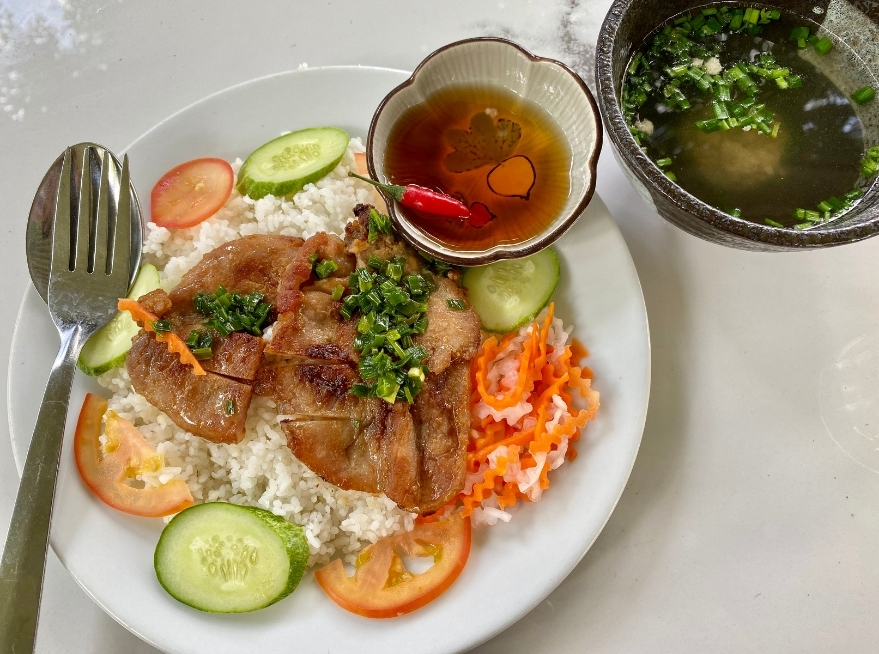 Com tam: Broken rice served with grilled pork, egg meatloaf, and fish sauce