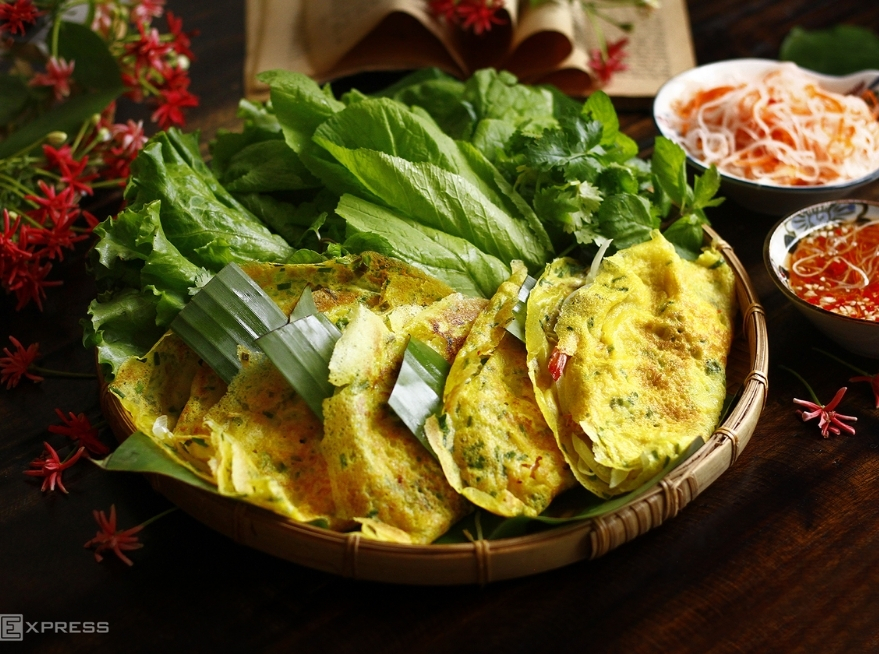 Banh xeo: A crispy rice flour pancake filled with shrimp, bean sprouts, and pork